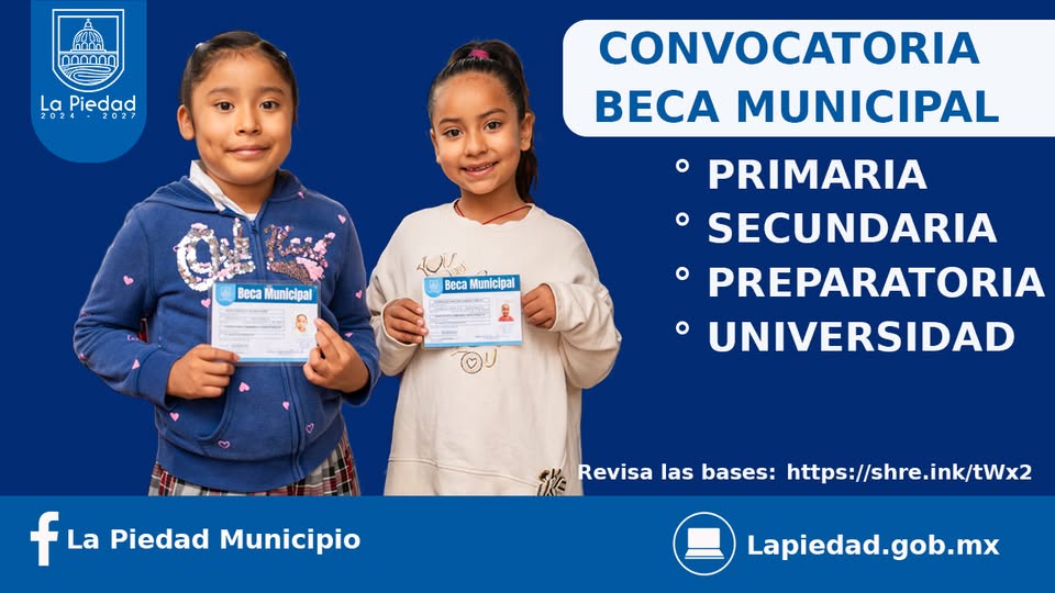 Con el objetivo de contribuir e impulsar la educación de niños, adolescentes y jóvenes, el Gobierno Municipal de La Piedad, a través de la Dirección de Educación, emite la convocatoria para ser beneficiario de la Beca Municipal para el ciclo escolar 2025 – 2026.