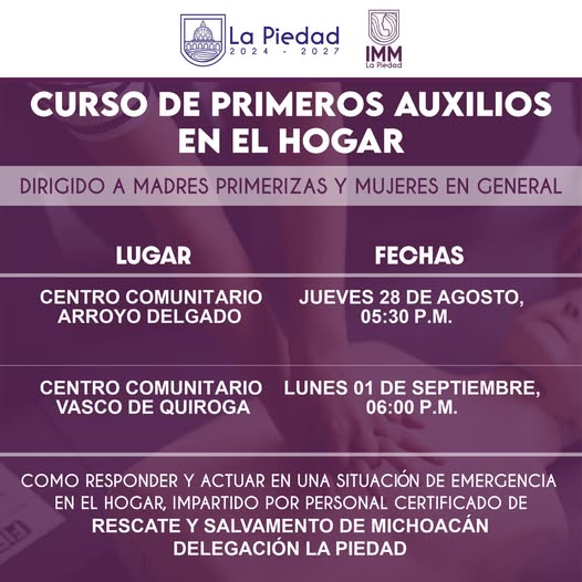 A través del Instituto Municipal de la Mujer (IMM) el Gobierno de La Piedad, que encabeza el alcalde Samuel Hidalgo Gallardo, hace una cordial invitación a las mujeres de la ciudad para que acudan al curso de primeros auxilios que se tiene programado para este mes.