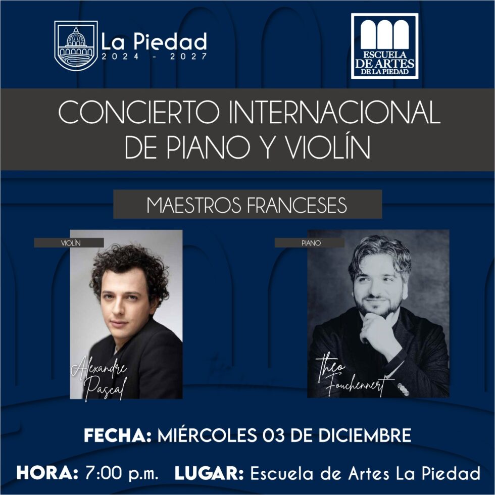 A través de la Dirección de Cultura, el Gobierno Municipal de La Piedad, encabezado por el presidente Samuel Hidalgo Gallardo, junto con la regidora de Cultura, invita a la población en general a participar este miércoles 3 en el concierto internacional de piano y violín preparado para nuestra ciudad.